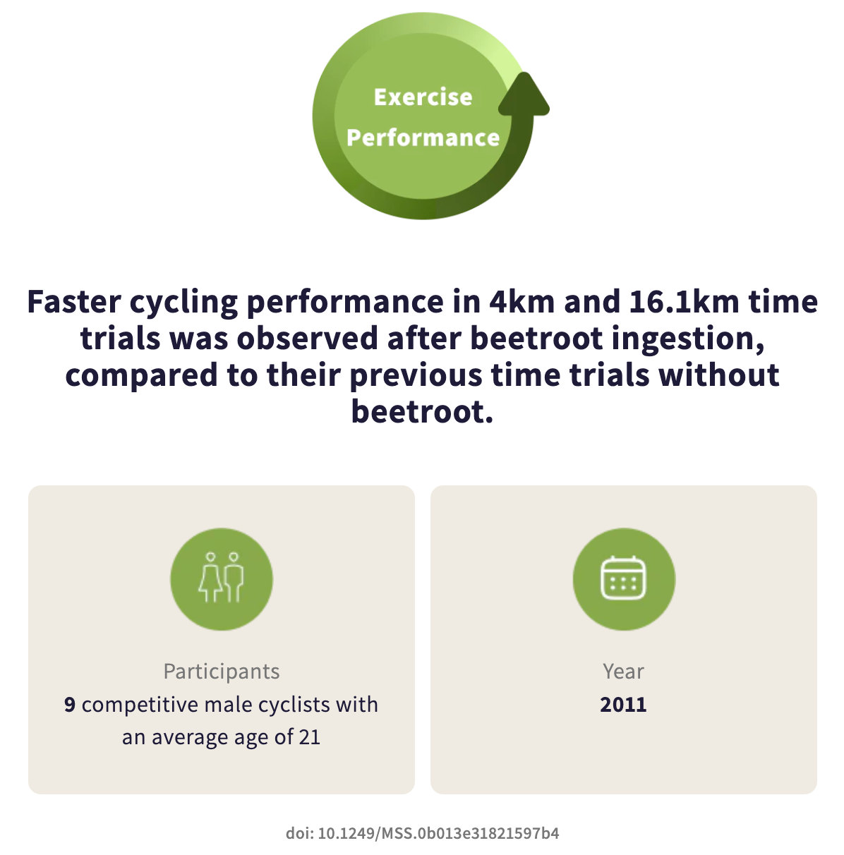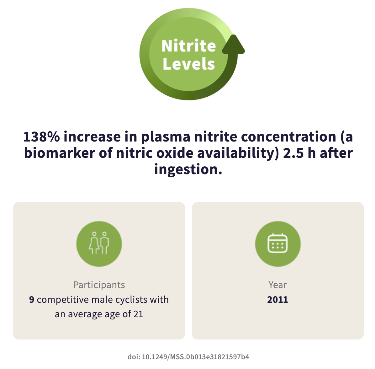 These improvements were mainly attributed to higher blood nitrate levels as beetroot is a potent source of nitrate. Nitrate is converted to nitric oxide in the body, and nitric oxide widens blood vessels and improves blood flow, allowing more oxygen to be transported to muscles.